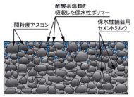 化学系凍結抑制舗装(添加剤吸着型)は、半たわみ性舗装のセメントミルクに凍結抑制剤を吸着させる材料を添加し、吸着した凍結抑制剤が徐々に路面に溶出し、氷結点を下げることにより凍結を抑制する舗装です。