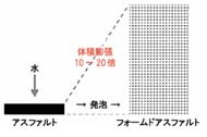 加熱アスファルトを泡状にするには、水蒸気または水と加熱したアスファルトに接触混合する方法や特殊添加剤を混合時に加える方法などがあり、発泡したアスファルトの体積は元のアスファルトの10~20倍にまで瞬間的に膨張し、この状態でのアスファルトの粘性は大幅に減少し、常温で湿潤状態の骨材との混合や被覆が可能となります。
