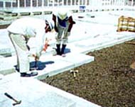 天然石ブロック舗装は、通常コンクリートを基盤として、敷きモルタルの上に平面が長方形、正方形、不整形の板石、あるいは立方体、直方体の小舗石を敷き並べる工法です。石質は花崗岩、砂岩など多種多様で、モルタルを使わず、石同士のかみ合わせにより舗設する場合もあります。
