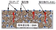 凍結抑制舗装(弾性体・塩化物添加型)は、改質アスファルトを用いた特殊な粒度のアスファルト混合物に廃タイヤなどから製造したゴムチップと塩化物を添加した舗装で、ゴムチップの弾性による物理的作用と、塩化物の溶け出しによる化学的作用の相互作用で路面の氷結に対応する凍結抑制舗装です。